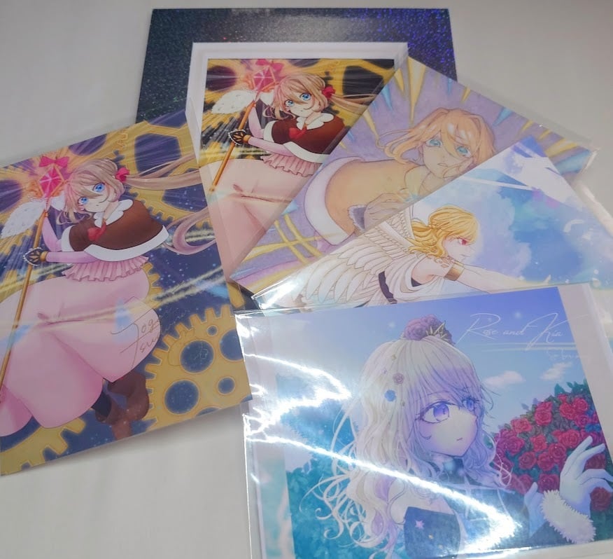 オリオン様にて出展作品をもとに製作していただいたアートペーパーフレームとアートペーパーに印刷していただいた複製画に、入れ替え用に選定したポストカード3点とサイン入りポストカードをセットにしてお届けします。