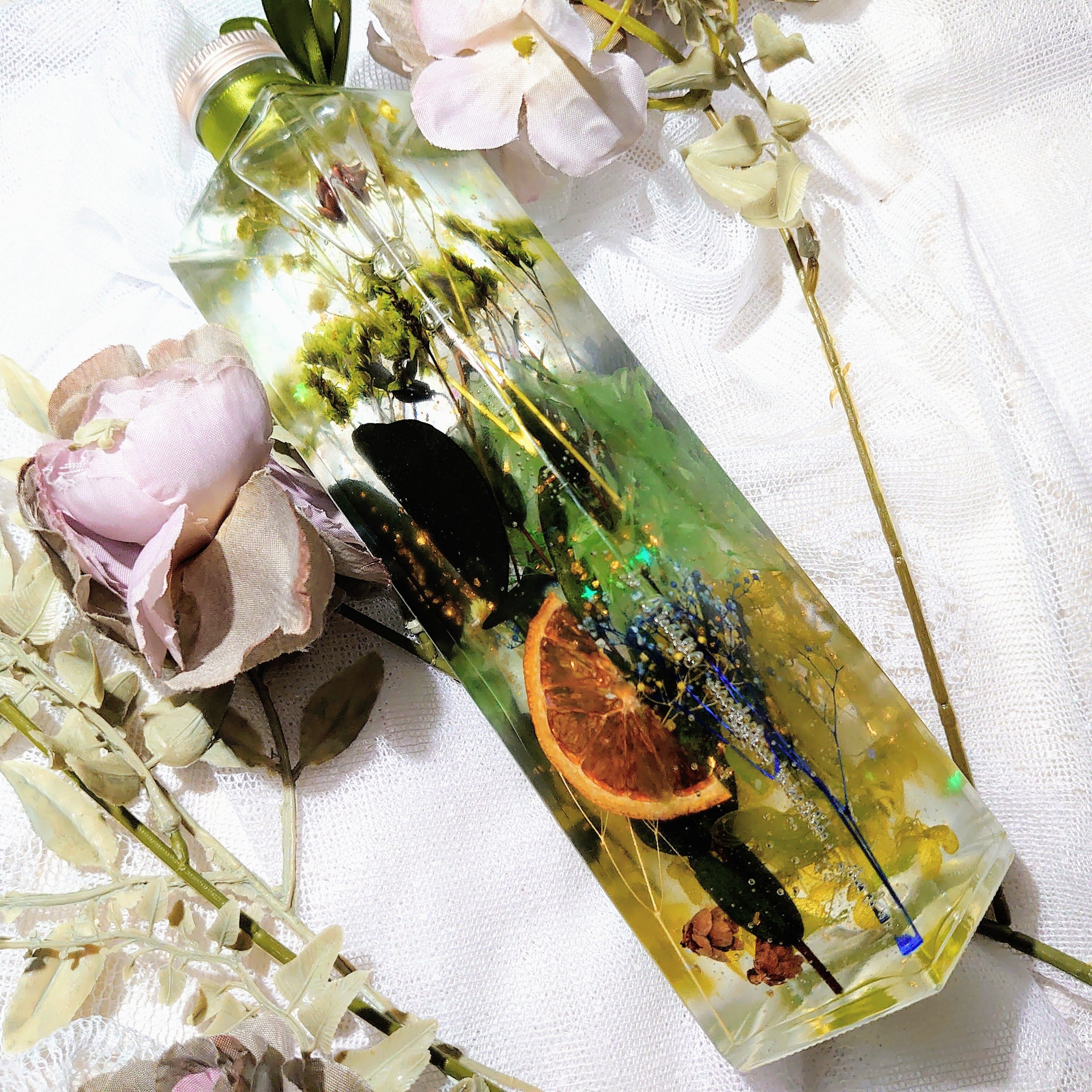 オレンジグリーンティーは、オレンジと緑系の花々のコントラストが美しいハーバリウムです。