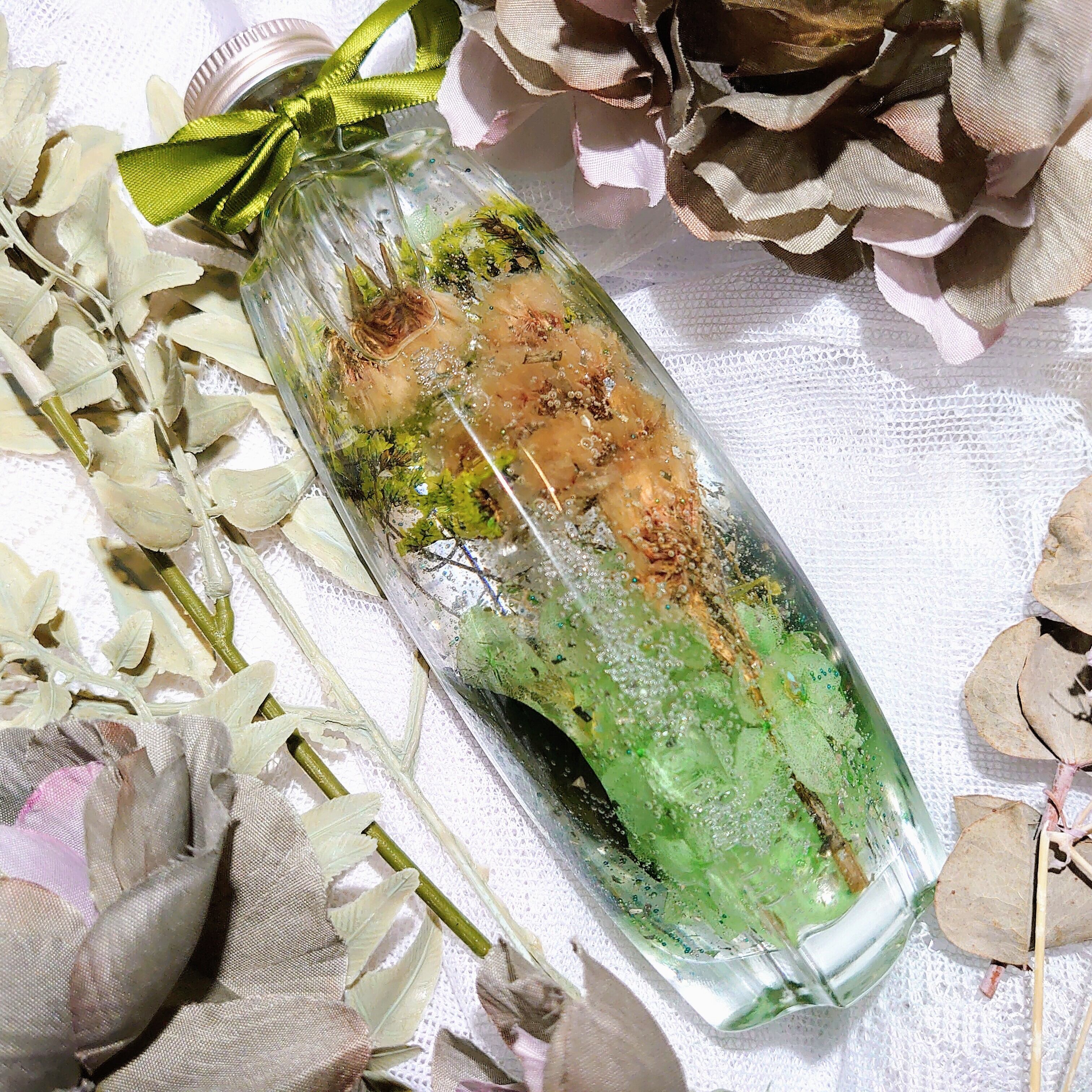 開花は、緑を基調とし、アンティーク調のお花を加えた、自然の癒しと美しさを閉じ込めたハーバリウムです。