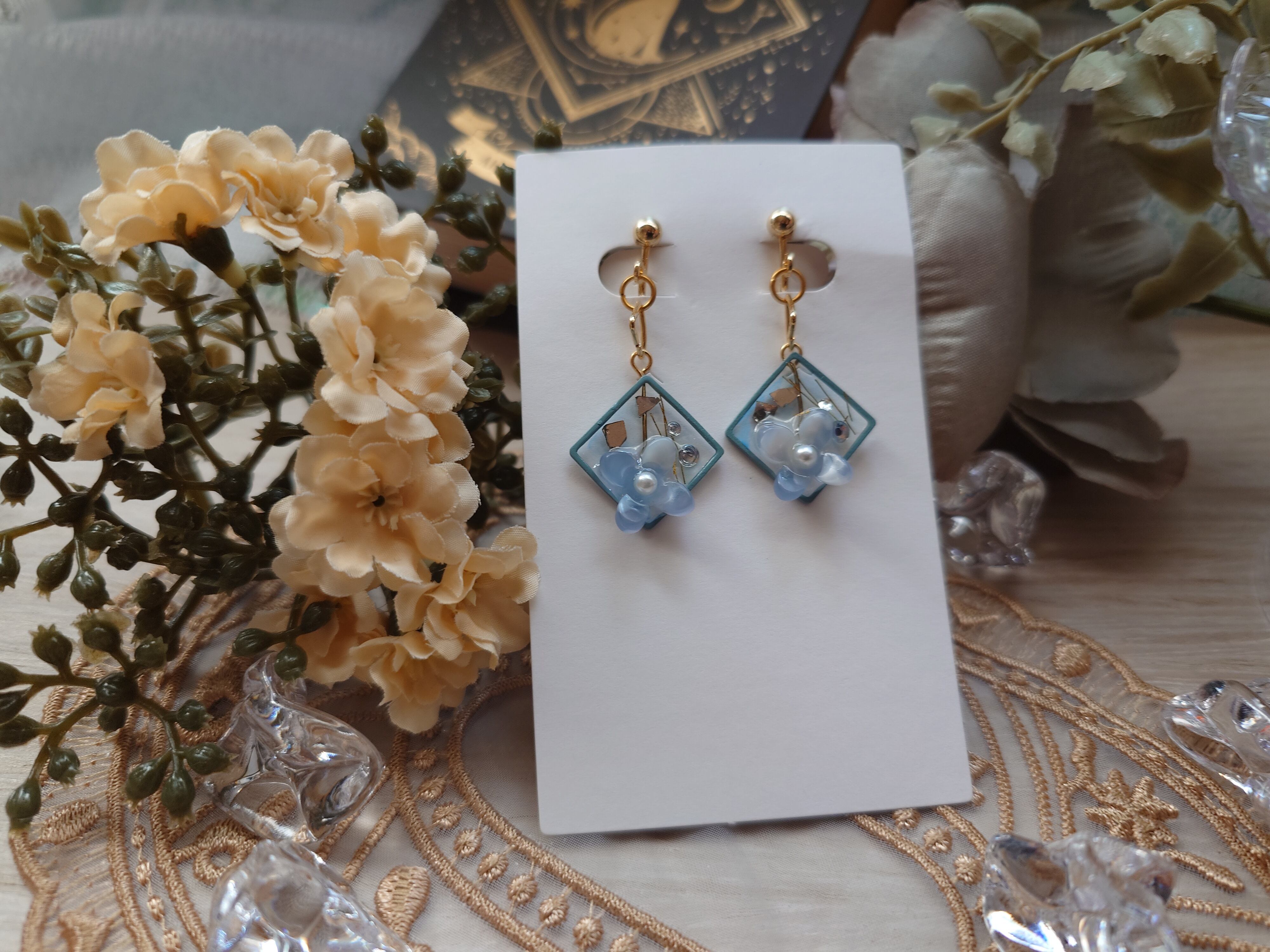 お花と額をイメージして作成したイヤリング・ピアスです。